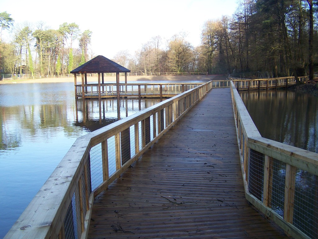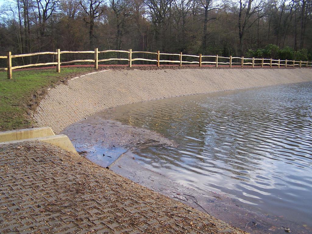 There were many different elements that went into regenerating Titmus Lake. This project included tree and stump removal, desilting of the lake, reprofiling and raising the crest of the dam, installing a functioning inspection chamber with a galvanised trash screen and drainage to an outfall lined with gabion scour protection. We also constructed footpaths using recycled crushed brick and installed post and rail fencing as a finishing detail. We also had the pleasure of designing and erecting a bespoke over water walk way and observation platform. This walk way is purpose built for the local nature centre that is in use all year round.